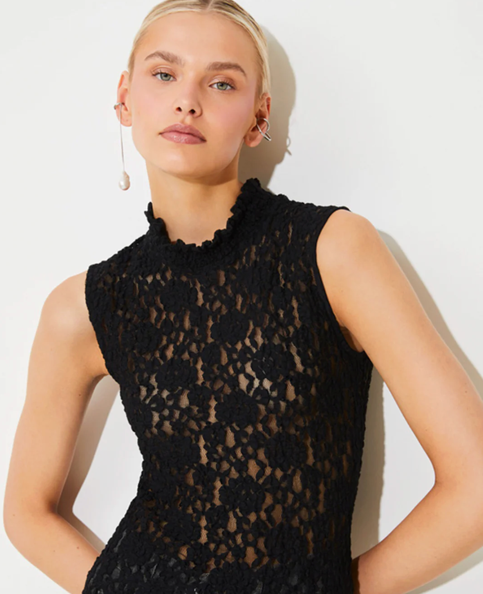 Delicate yet refined, this lace blouse features a high ruffled neckline and a close-fitting silhouette that flatters the figure. Crafted from a soft, stretchy lace blend, it adds a touch of romantic charm to any look โ perfect for layering or wearing on its own.